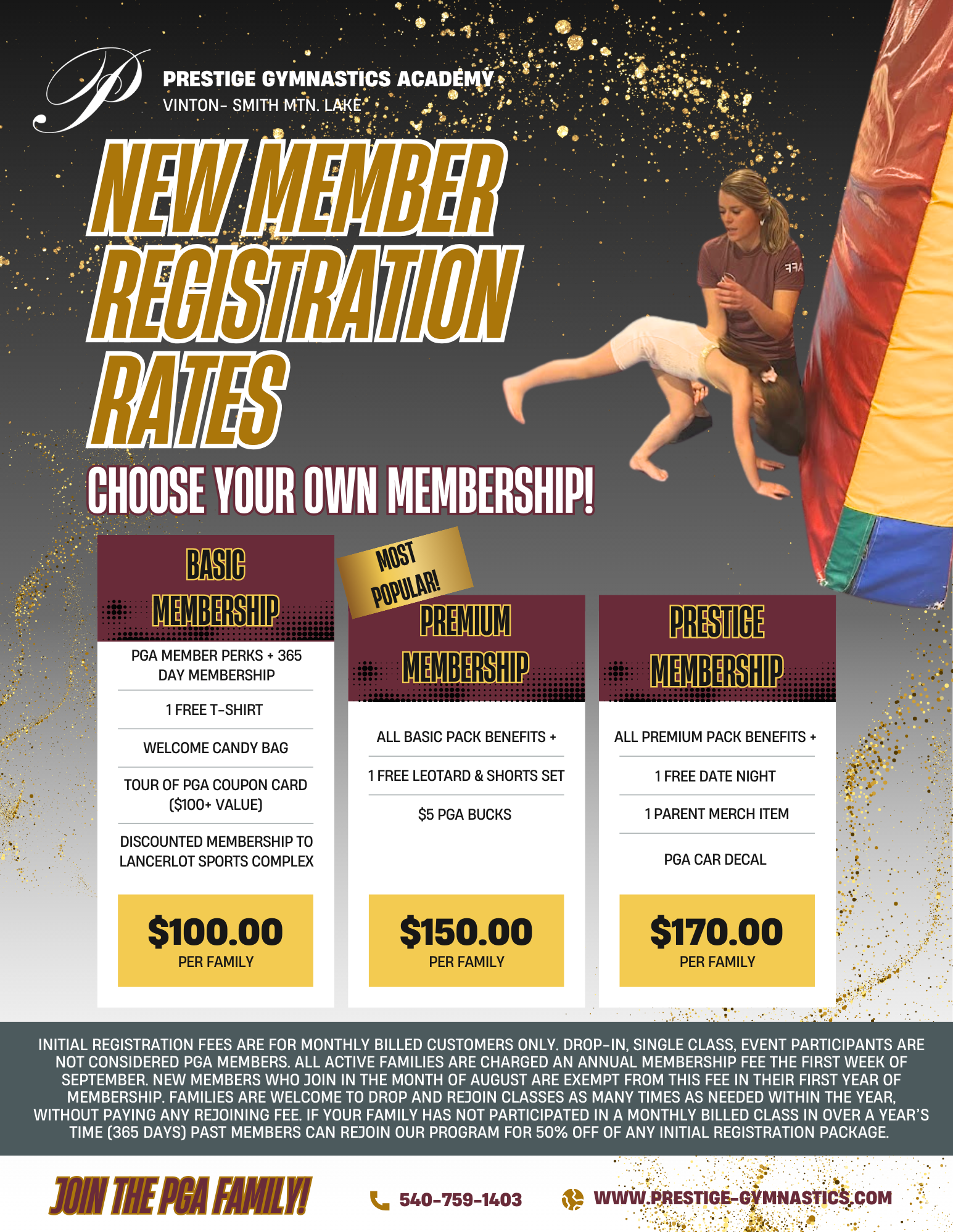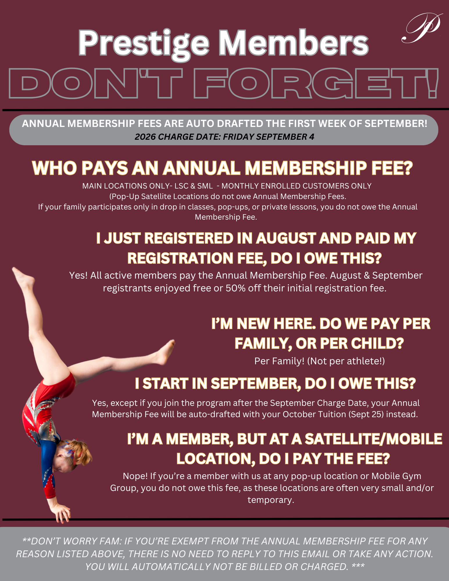 Take a minute to check out our policies. You will be required to sign that you acknowledge these policies before you become a member of Prestige Gymnastics Academy.